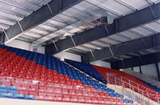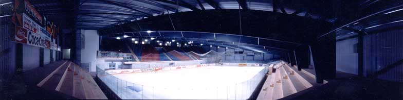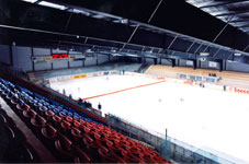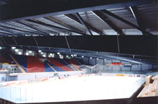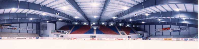 Nebelfreie Sicht Die Spielfeldhallen sind als Dunkelhallen (ohne Fenster) im Industriestandard konzipiert worden. Es wurde viel Sorgfalt auf den optimalen Materialwahl und auf die Festlegungen der Ausführungsdetaile ge-legt. Die Sichtverhältnisse im Stadion sind ideal, da weder Hallenstützen noch Geländer, Stangen oder Netzgitter die Sicht beeinträchtigen können. Die Absturzsicherungen bei den Tribünen, wie auch die Bandenverglasungen wurden aus stützenfreien, seku-risierten Glaselementen ausgebildet. Die für Europa neu eingesetzten „Supportless-Banden-Systeme“ wurden bisher nur in der NHL eingesetzt. Die Schutz-gläser aus Echtglas statt aus den herkömmlichen Polykarbonatplatten sorgen nebst klarer Sicht auch für eine Langzeit-Haltbarkeit. Die Tribüne ist mit vanda-lensicheren Doppelwand-Schalensitzen mit Luft-kammern (passt sich der Körpertemperatur an), aus-gestattet. Die Hallen sind dank einer Entfeuchtungs-anlage bei jeder Witterung völlig nebelfrei. Die Steh-tribüne reicht direkt bis ans Eisfeld. Das Erlebnis des Zuschauers wird so erhöht. |